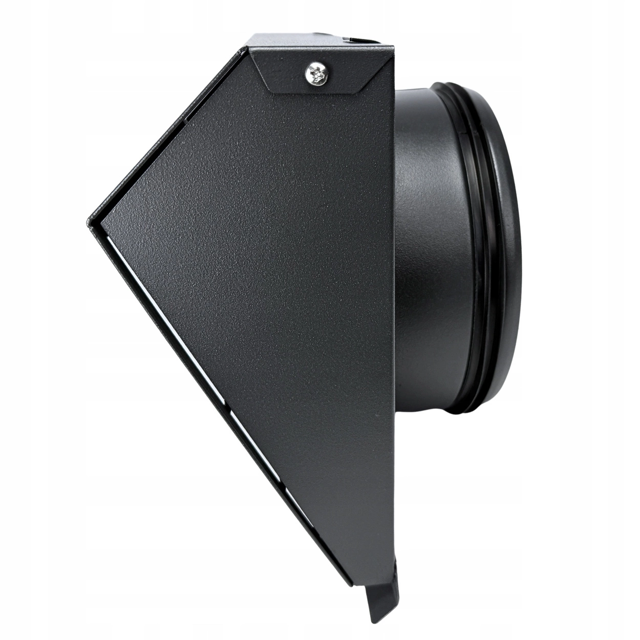 Kołnierz montażowy z gumową uszczelką dwuwargową gwarantuje szczelne osadzenie wyrzutni, a cztery otwory montażowe w narożnikach umożliwiają pewne przykręcenie do ściany. Boczne mocowanie odłączalnego frontu pozwala na szybki demontaż w celu czyszczenia i konserwacji.