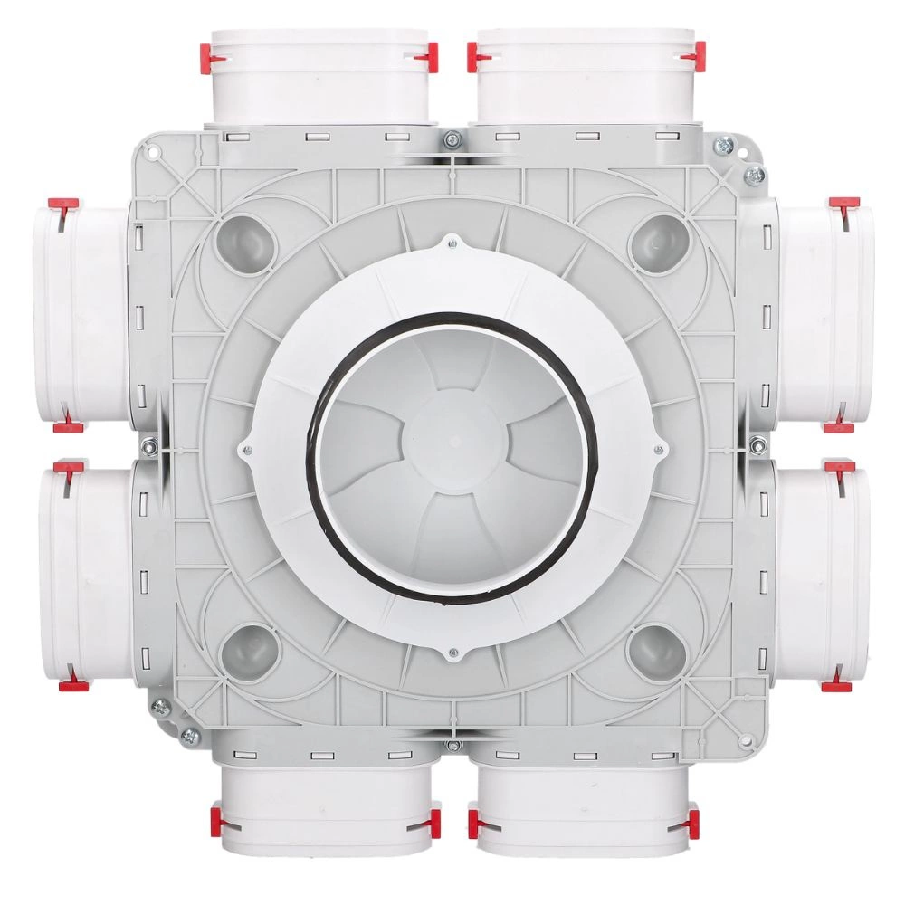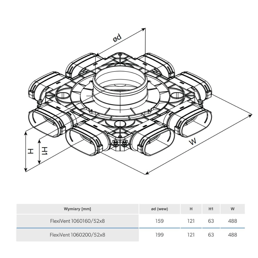 Rozdzielacz 8-króćcowy 8x52/160 mm FlexiVent to wysokiej jakości element systemu wentylacji mechanicznej z odzyskiem ciepła. Umożliwia skuteczne rozprowadzenie powietrza do elastycznych kanałów wentylacyjnych 52 mm, a dzięki króćcowi Ø160 mm łączy się bezpośrednio z rekuperatorem.