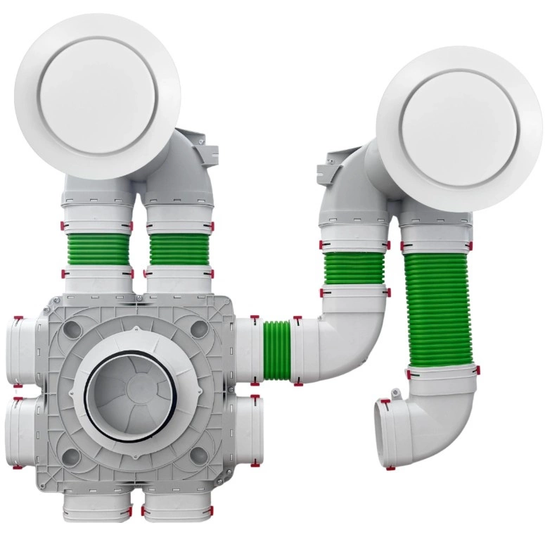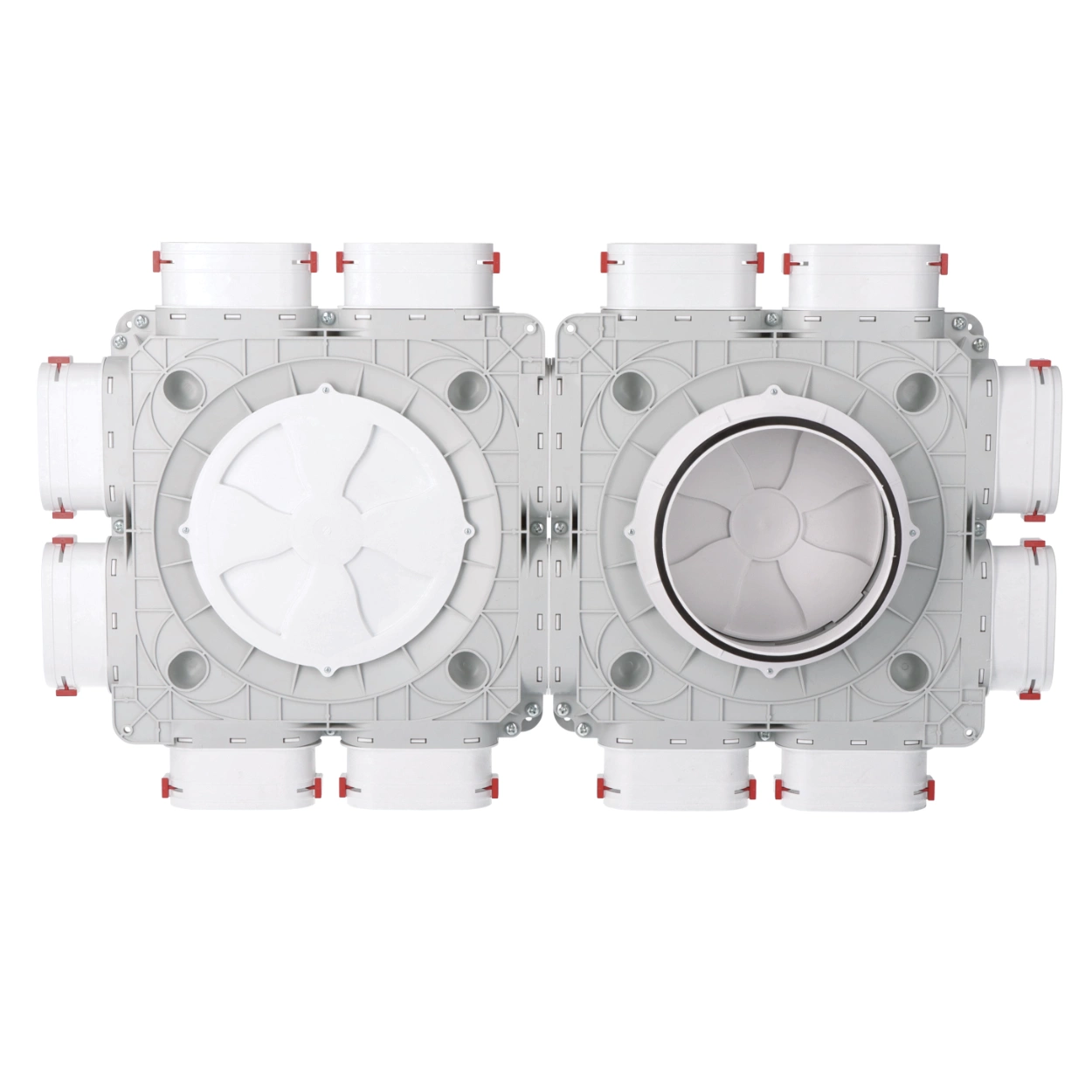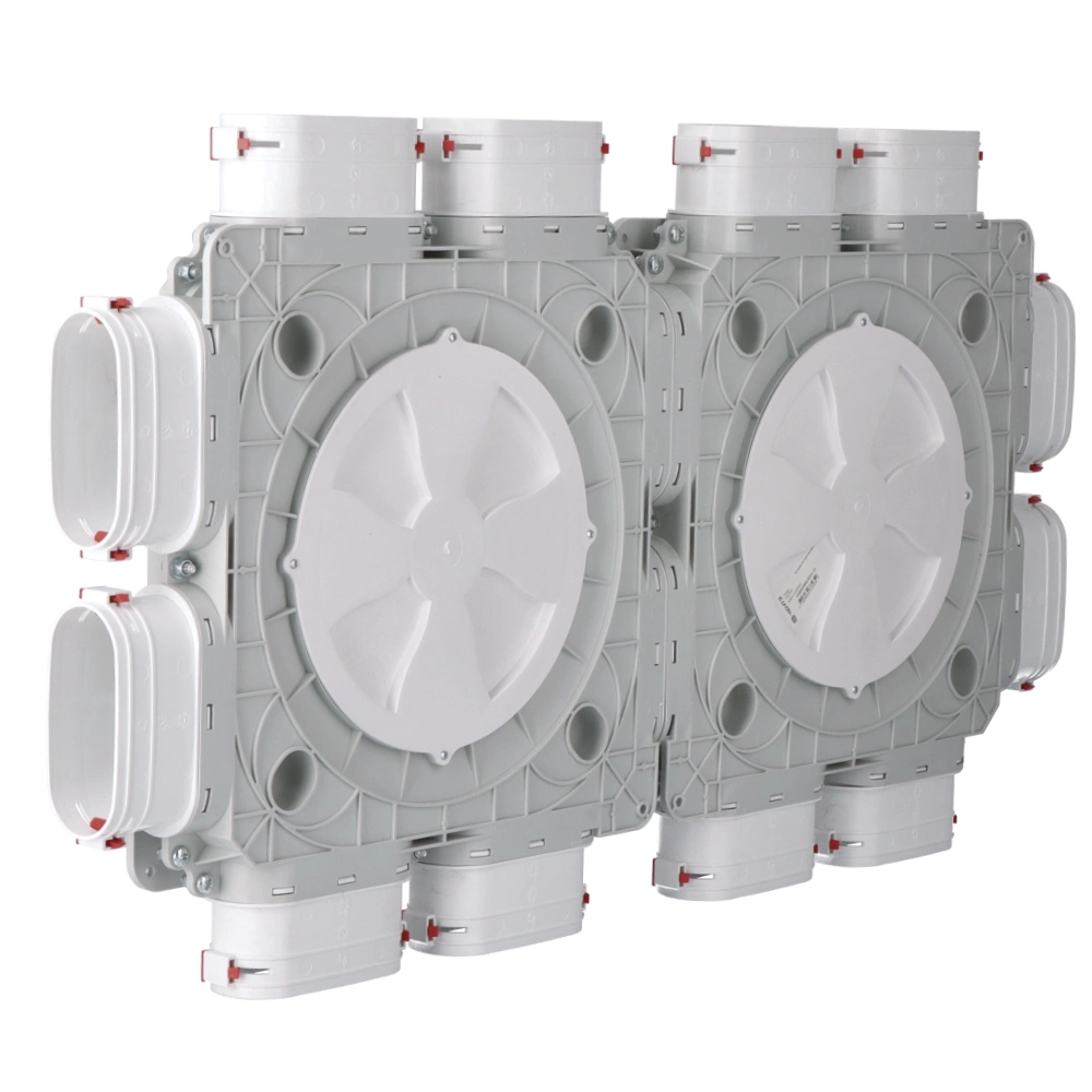 Rozdzielacz podwójny 12x52/160 mm z systemu FlexiVent to solidny element instalacji wentylacyjnej, przeznaczony do dystrybucji powietrza w systemach nawiewno-wywiewnych. Wyposażony w 12 króćców przyłączeniowych, wykonany z trwałego tworzywa sztucznego odpornego na uszkodzenia mechaniczne.