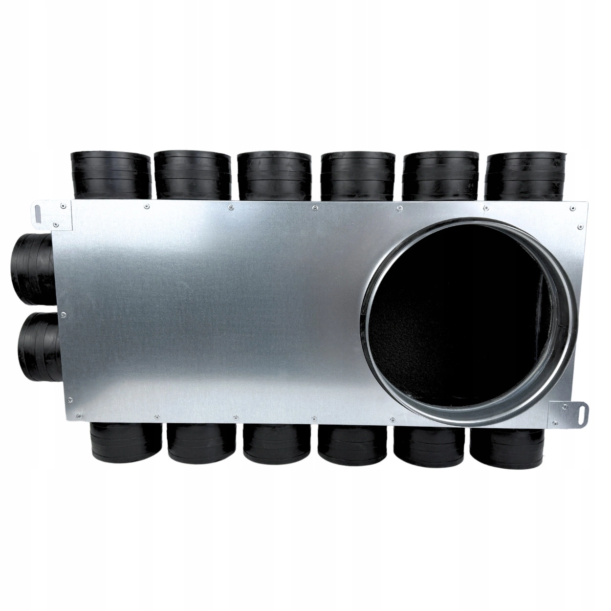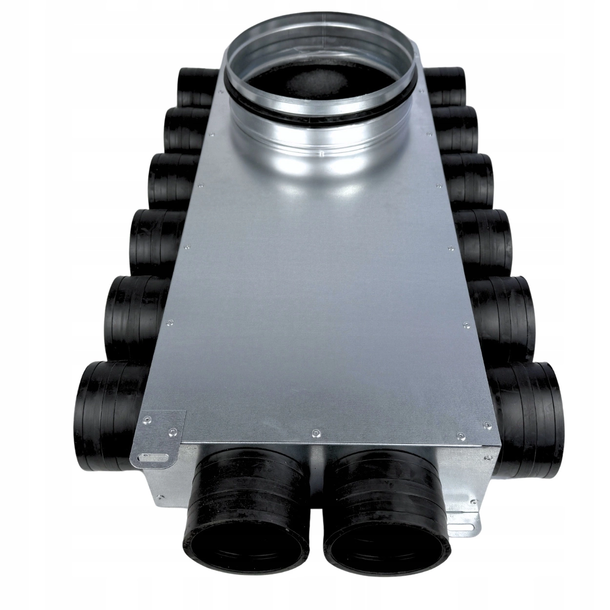 Wyposażony w 14 króćców Ø75 mm oraz przyłącze główne Ø200 mm, gwarantuje dużą wydajność i obsługę wielu punktów nawiewnych i wyciągowych. Dzięki gumowym króćcom samouszczelniającym montaż przebiega szybko, a połączenia są w pełni szczelne bez konieczności stosowania dodatkowych uszczelek.