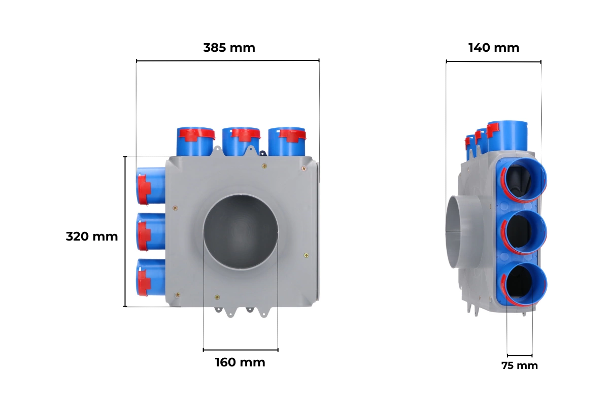 Rozdzielacz wentylacyjny 6x75/160 FLEX to nowoczesny i funkcjonalny element systemów wentylacji mechanicznej z odzyskiem ciepła (rekuperacją). Dzięki innowacyjnej konstrukcji modułowej umożliwia samodzielne wykonanie rozdzielaczy powietrza w wersji przelotowej lub nieprzelotowej – od 3 do nawet 18 króćców. Rozdzielacz można montować w podłodze, sufitach podwieszanych oraz ścianach szkieletowych, co czyni go niezwykle uniwersalnym rozwiązaniem dla różnych typów instalacji.