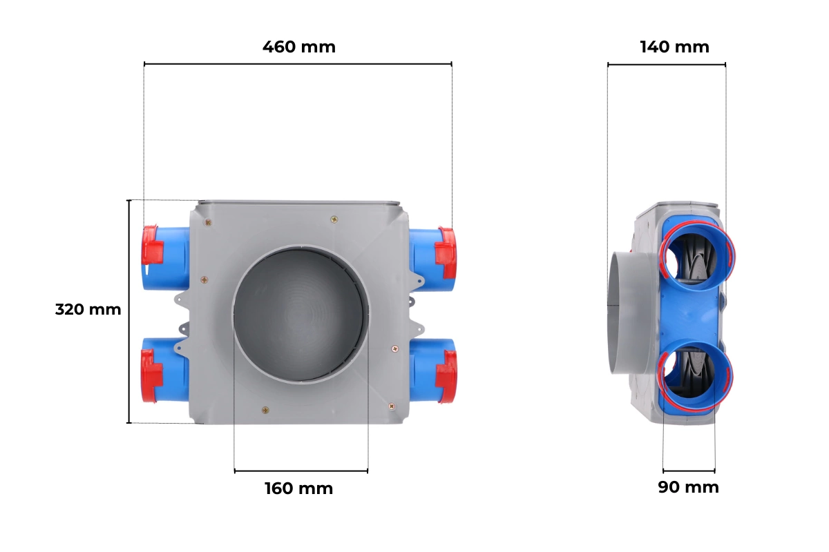 Skrzynka rozdzielcza 4x90/160 FLEX to nowoczesny element systemów wentylacji mechanicznej z odzyskiem ciepła (rekuperacją). Dzięki modułowej konstrukcji umożliwia tworzenie rozdzielaczy powietrza w wersji przelotowej i nieprzelotowej – od 2 do 12 króćców. Skrzynkę można zamontować w podłodze, sufitach podwieszanych oraz ścianach szkieletowych, co zapewnia jej uniwersalne zastosowanie w różnego rodzaju instalacjach wentylacyjnych.