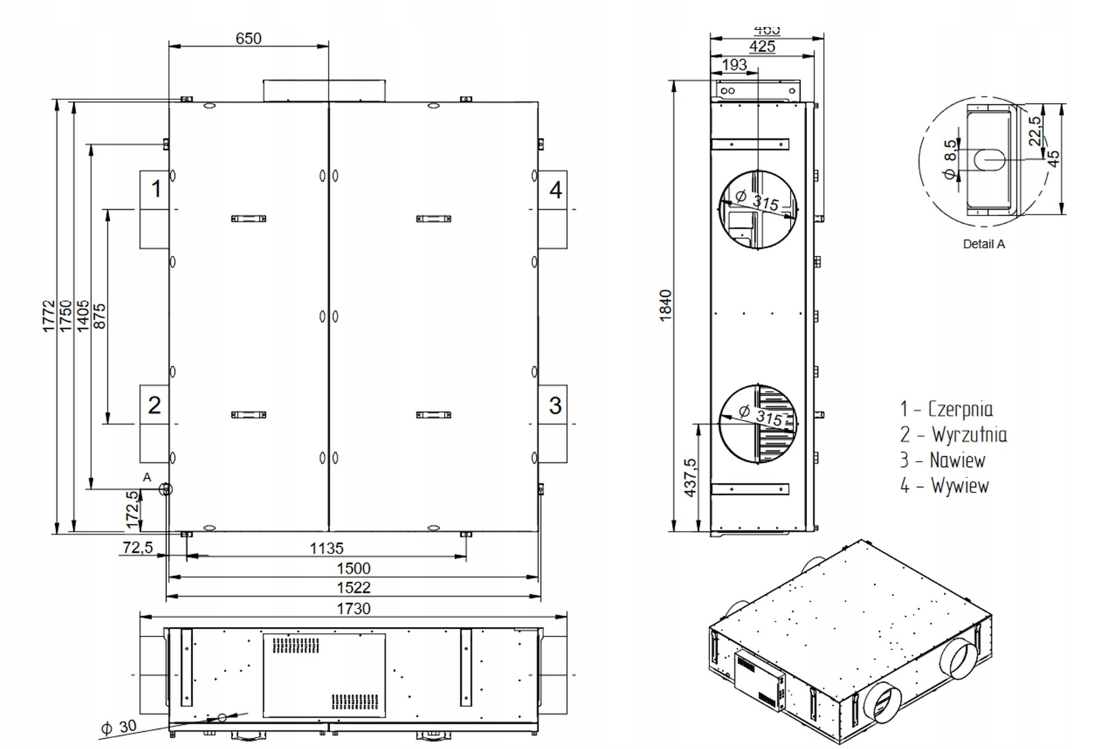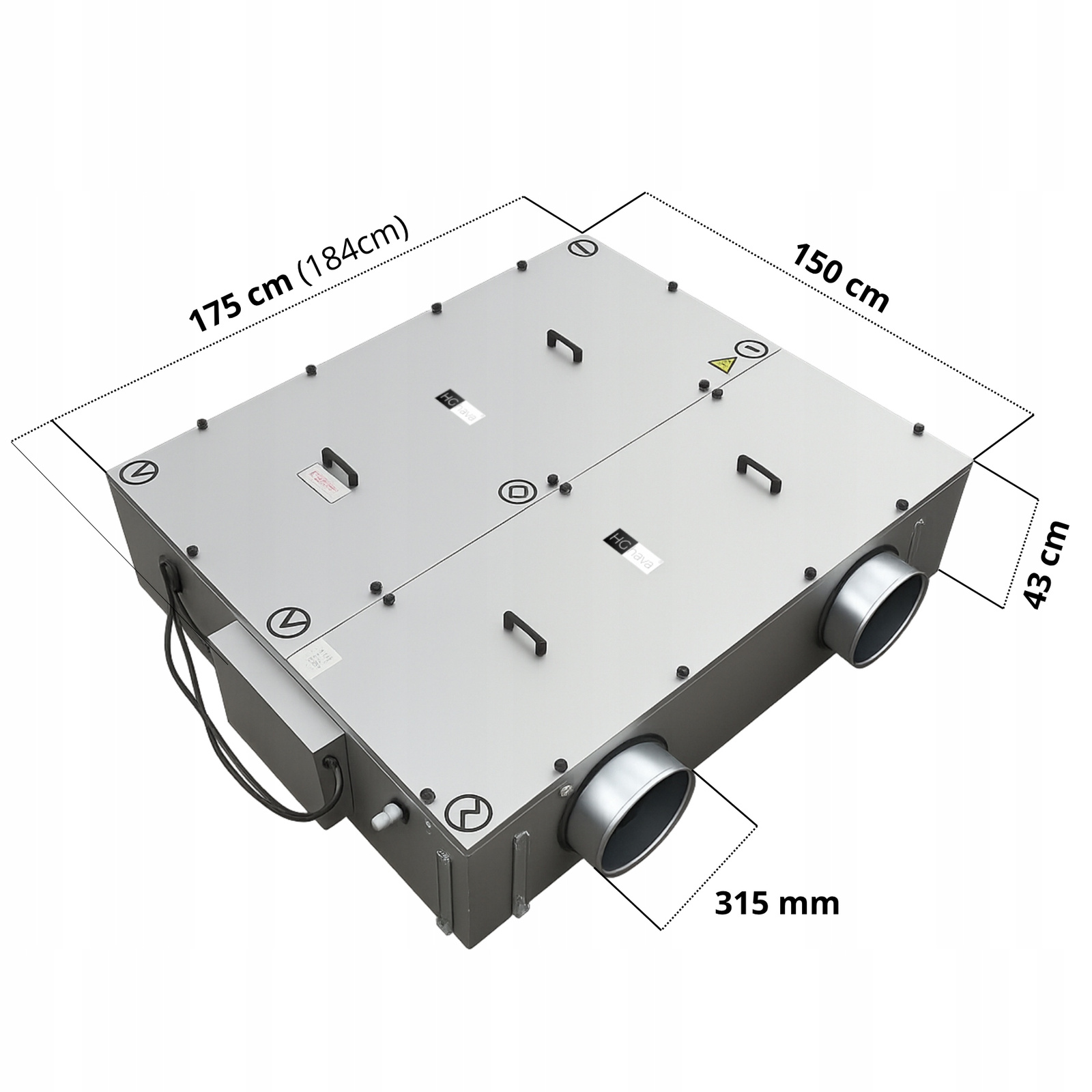 We wnętrzu centrali znajduje się wymiennik ciepła wysokiej jakości (odzysk ciepła do 95%). Urządzenie na czerpni i wywiewie zabezpieczono filtrami, aby uniknąć zabrudzenia wewnątrz. Po stronie wywiewu zamontowano również tacę ociekową na skropliny wraz z króćcem odpływowym.