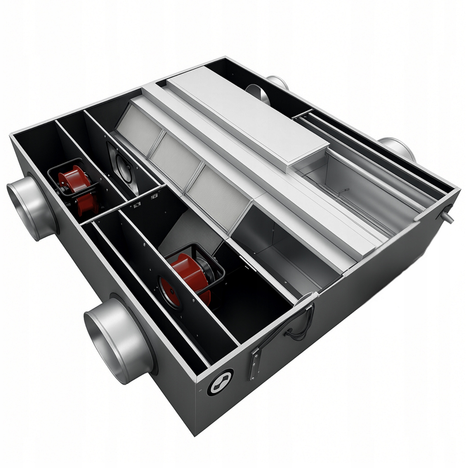 Centralę wyposażono w energooszczędne wentylatory z silnikami komutowanymi elektronicznie (EC) o wysokiej sprawności. Cały rekuperator, a w tym wymiennik i wentylatory, spełniają wymogi dyrektywy Ekoprojekt na rok 2018 (ErP 2018).