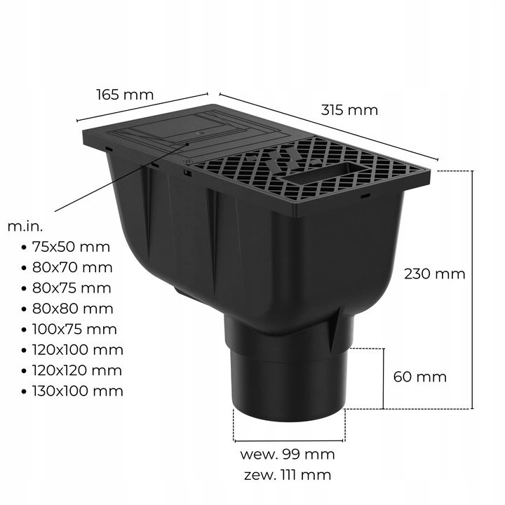 - Wejście na rynny kwadratowe: m.in. 75x50, 80x70, 80x75, 80x80, 100x75, 120x100, 120x120, 130x100