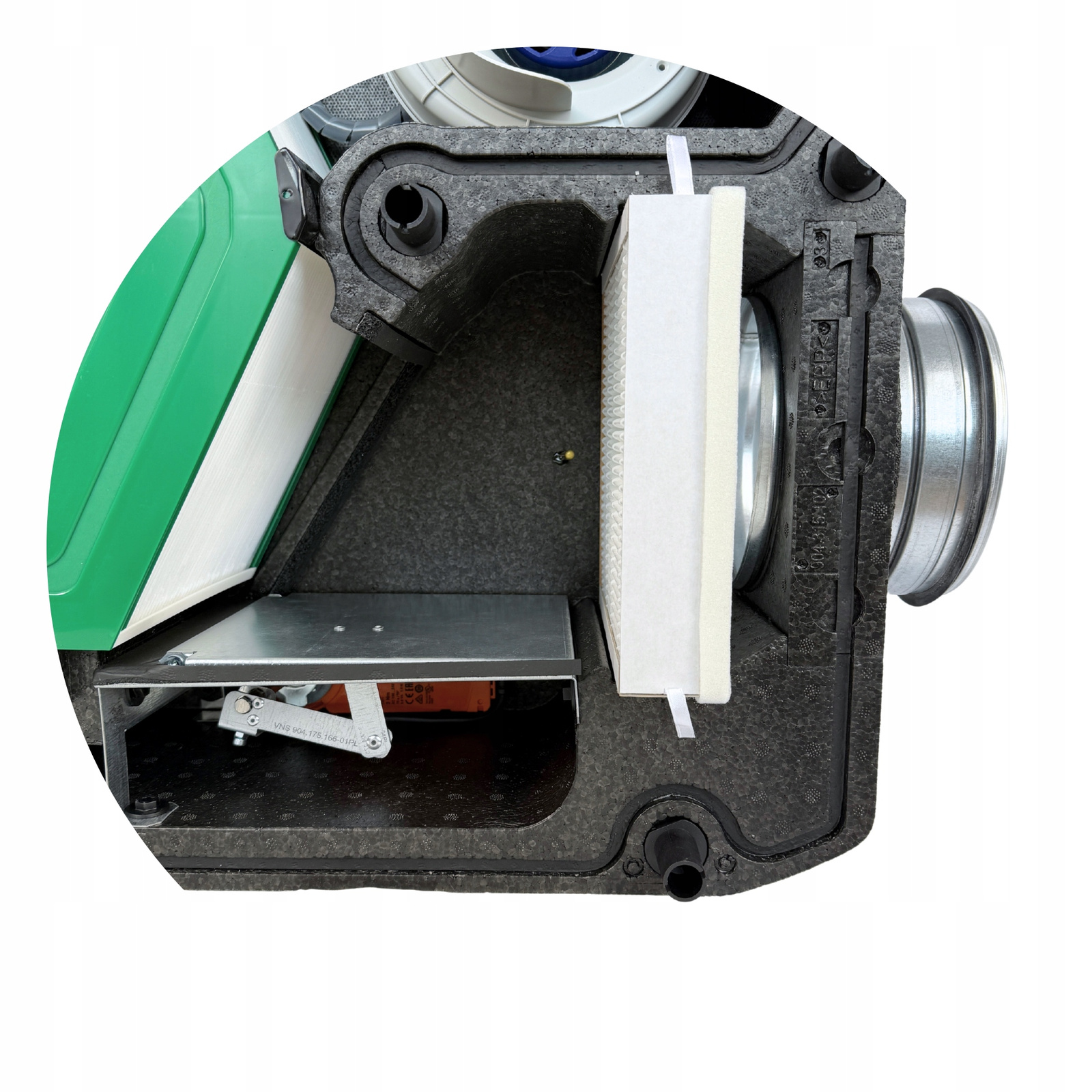Obudowa wykonana jest z spienionego polipropylenu (EPP), który cechuje się wysokimi właściwościami termoizolacyjnymi i akustycznymi.