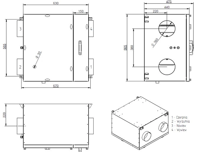 - Króćce przyłączeniowe: Średnica Ø160 mm, wykonane z blachy stalowej ocynkowanej.
