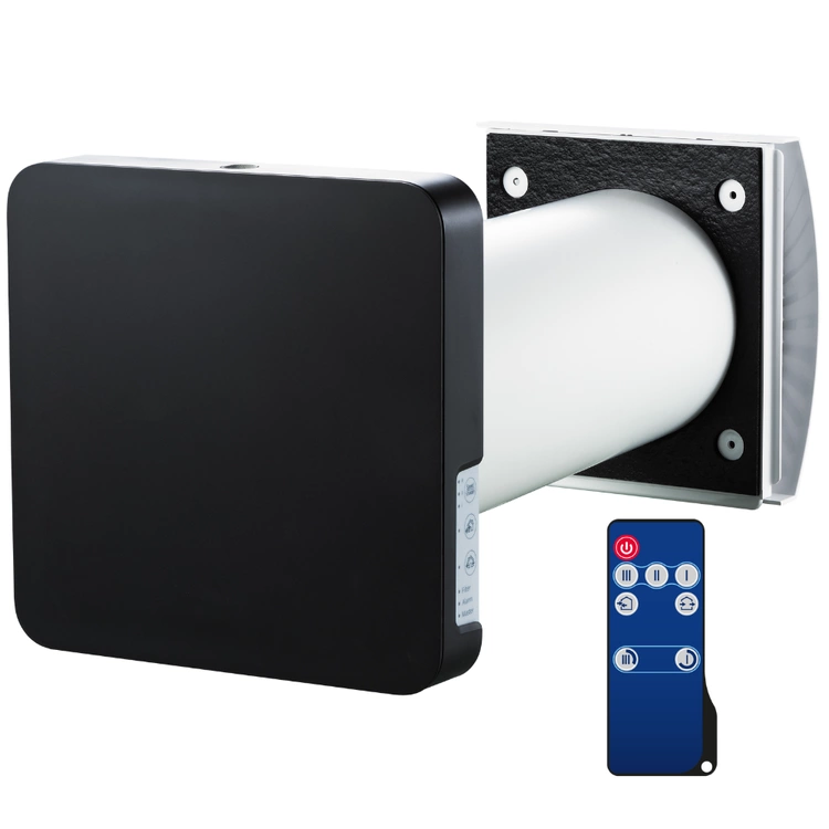BLAUBERG VENTO inHome Wi-Fi BLACK to nowoczesny system wentylacji decentralnej dedykowany do pojedynczych pomieszczeń w nowych i modernizowanych budynkach. Urządzenie łączy wysoką efektywność energetyczną z komfortem sterowania za pomocą smartfona, pilota lub dotykowego panela, oferując jednocześnie cichą pracę i skuteczną filtrację powietrza. Produkt w kolorze czarnym.