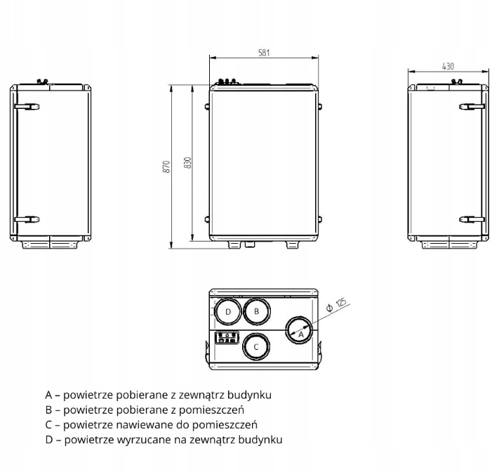 - Wymiennik ciepła — aluminiowy, krzyżowo-przeciwprądowy o wysokiej sprawności