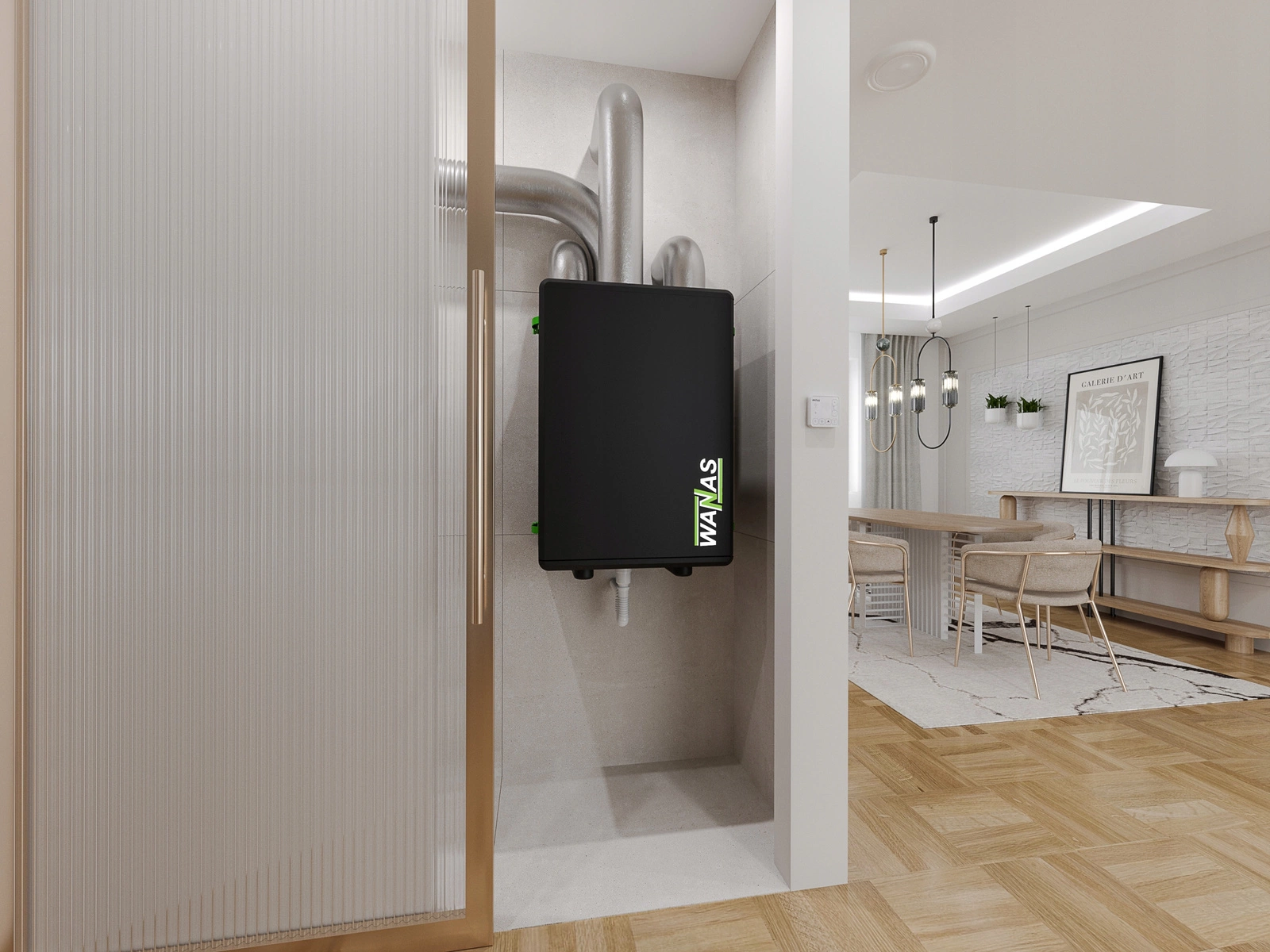 Rekuperator WANAS BLACK 300V to nowoczesna centrala wentylacyjna o wydajności odpowiedniej dla pomieszczeń do 115 m². Uniwersalna, dwustronna konstrukcja oraz lekki korpus ze spienionego polipropylenu (EPP) zapewniają doskonałą izolację termiczną i akustyczną, niską wagę oraz cichą pracę. Sterowanie odbywa się przez dotykowy panel ścienny DISPLAY V3, a ustawienia zaawansowane i harmonogram tygodniowy można konfigurować zdalnie przez aplikację WANAS CLOUD.