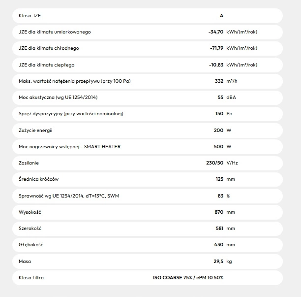 Powierzchnia wentylowana: do 149 m²