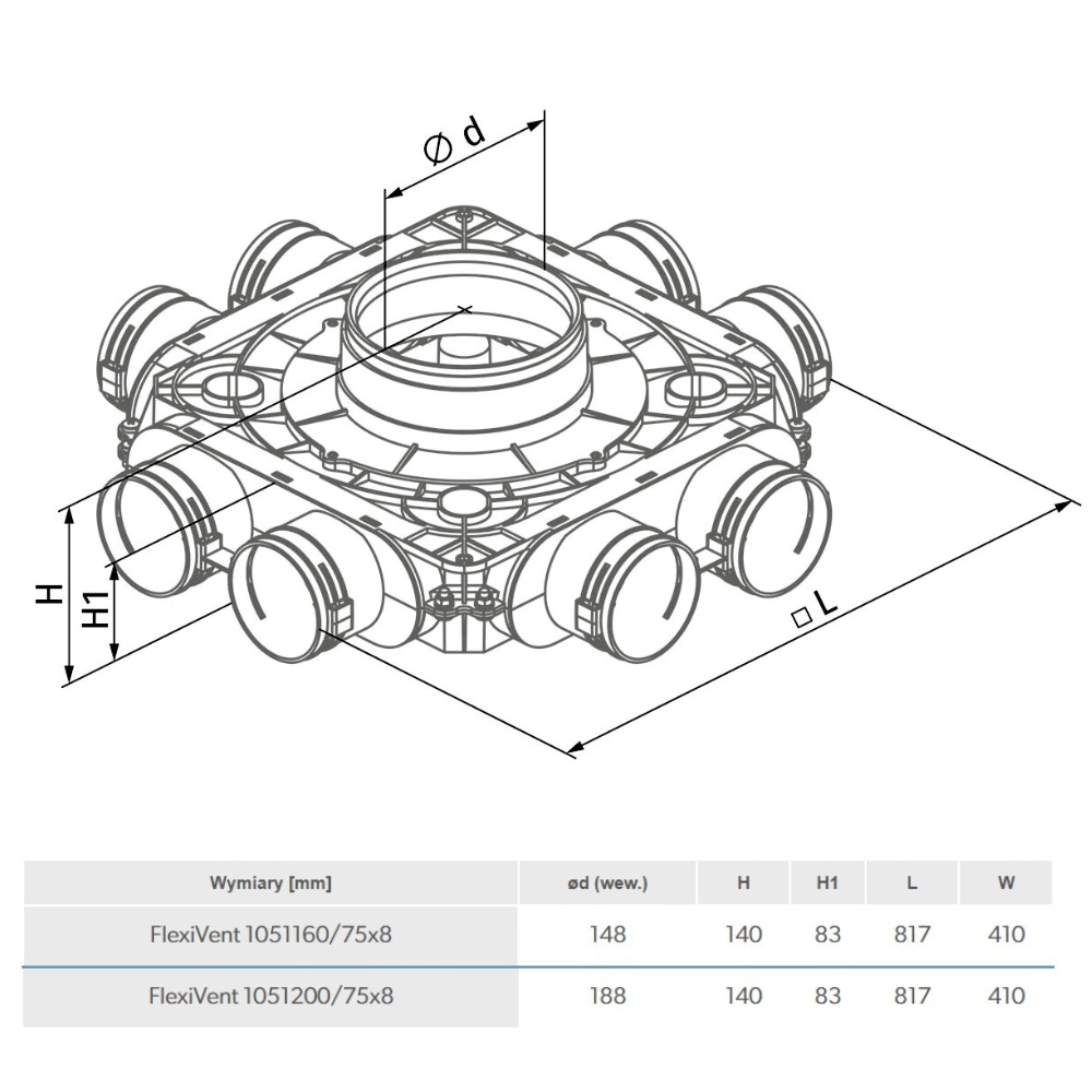 Wymiary przyłączeniowe: 8xØ75 mm oraz Ø200 mm