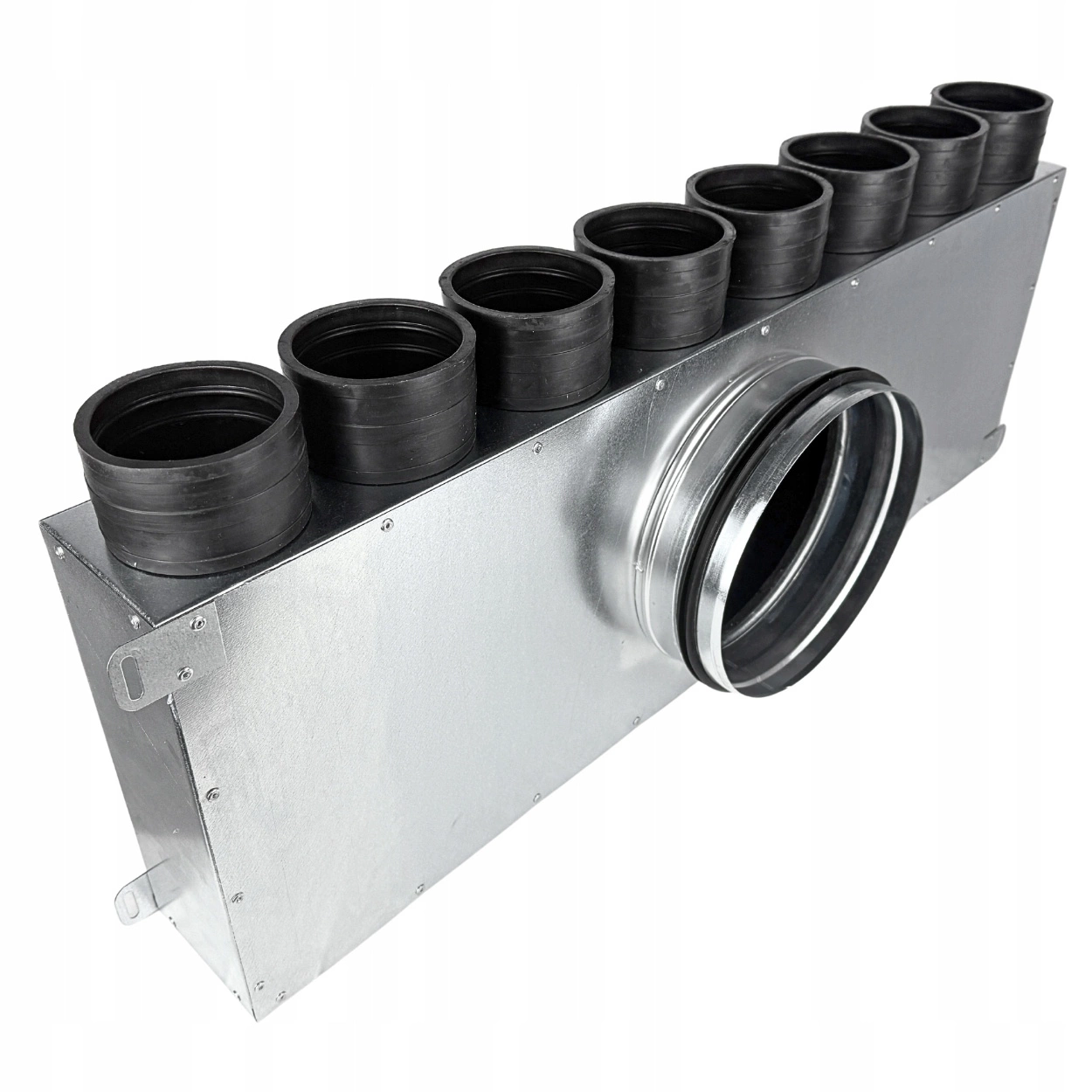 Rozdzielacz rurowy wentylacyjny 8x75 mm / Ø200 – z rewizją i przekładanym króćcem, stal ocynkowana