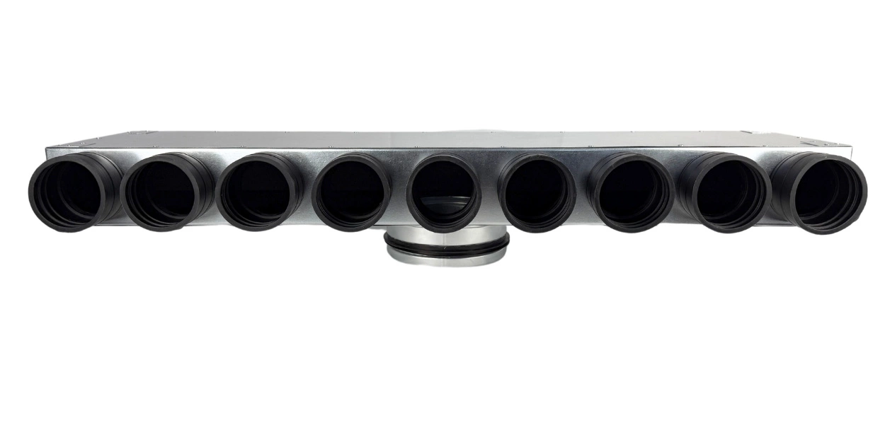 Rozdzielacz rurowy 9x75/160 to solidna skrzynka rozdzielcza przeznaczona do systemów wentylacyjnych opartych na karbowanej rurze dwuściennej Ø75. Dzięki 9 króćcom Ø75 oraz przyłączu Ø160 mm, doskonale sprawdzi się w instalacjach nawiewno-wywiewnych w domach jednorodzinnych, mieszkaniach i obiektach komercyjnych.