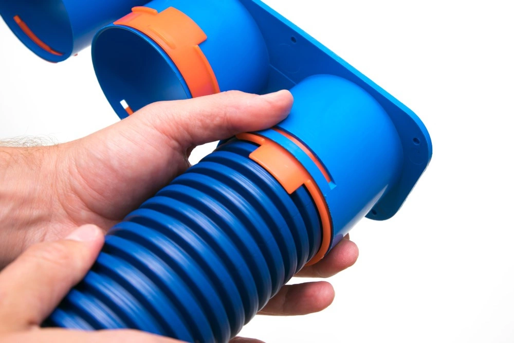 - kanały podłącza się poprzez nałożenie czerwonego pierścienia na rurę i osadzenie go w otworze