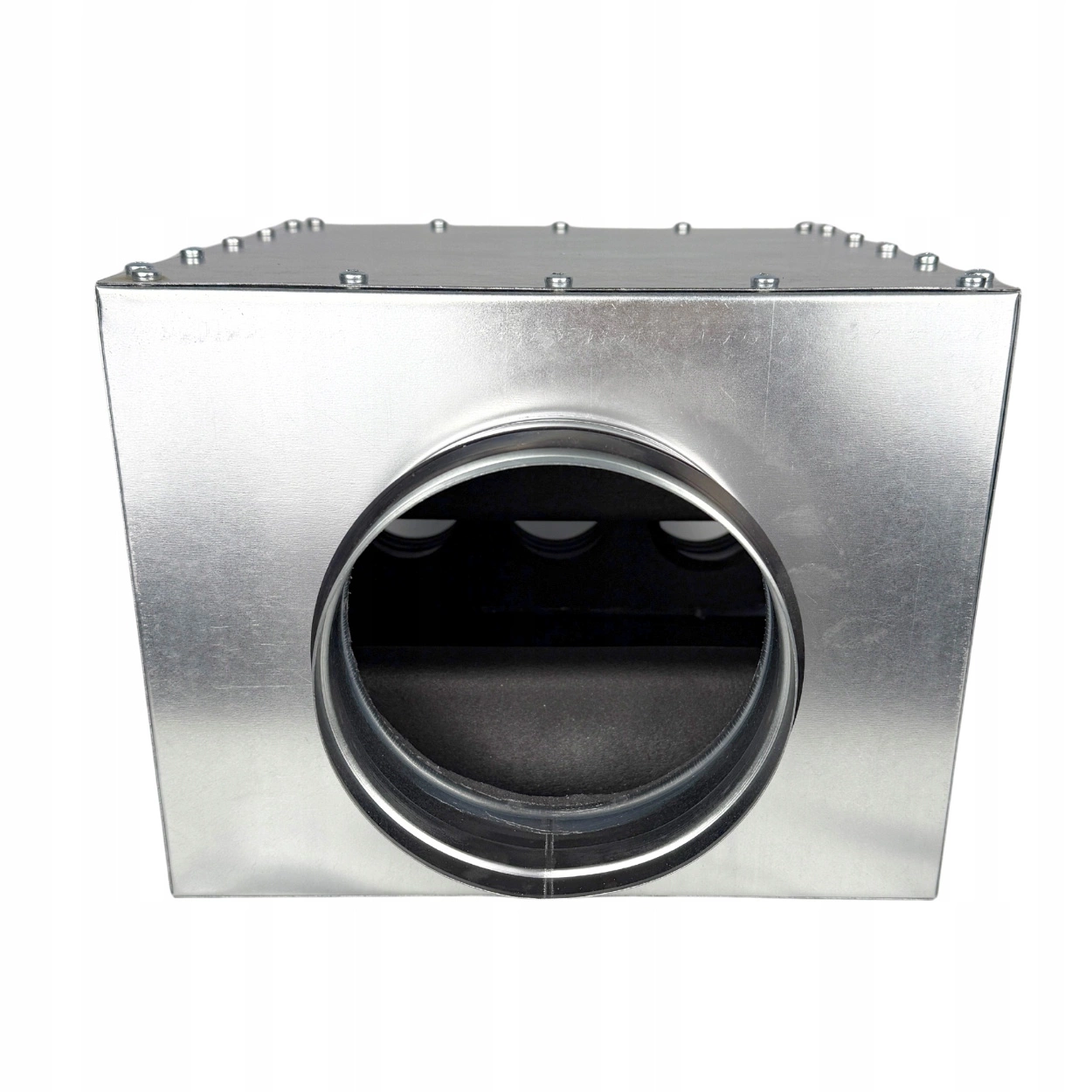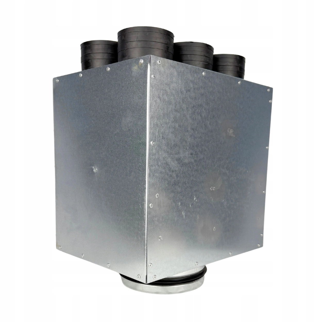 Rozdzielacz został wyposażony w 6 króćców Ø75 oraz przyłącze Ø160. Wewnętrzne tłumienie za pomocą antybakteryjnej maty wentylacyjnej ogranicza hałas i wspiera higienę systemu. Gumowe króćce samouszczelniające gwarantują szczelne i trwałe połączenia – bez konieczności stosowania dodatkowych uszczelek.