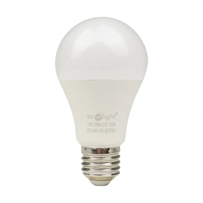 Energooszczędna żarówka LED E27 10W ECOLIGHT o ciepłej barwie światła (3000K) zastępuje tradycyjne żarówki 60W, zapewniając strumień świetlny 1000 lm przy wysokiej efektywności 100 lm/W. Wysoki współczynnik oddawania barw (CRI >80) gwarantuje naturalne odwzorowanie kolorów, tworząc przytulną atmosferę w mieszkaniach i przestrzeniach użytkowych.
