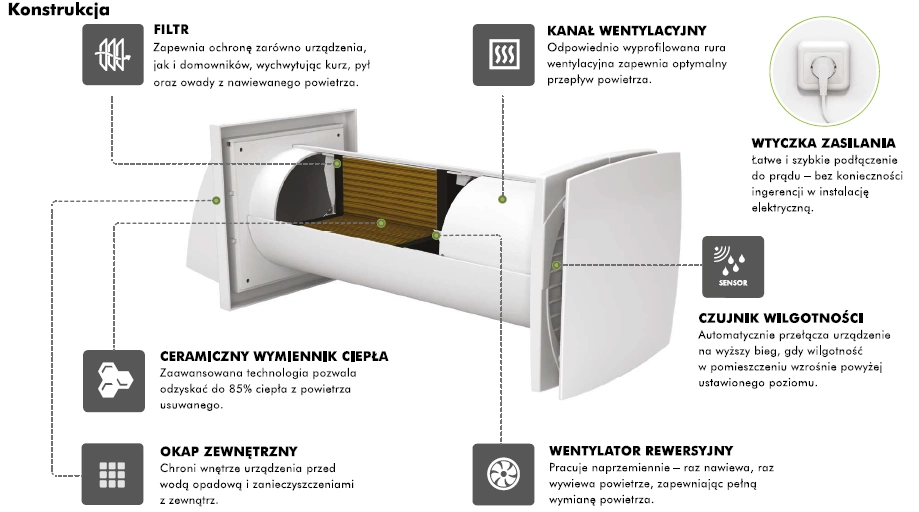 - Wentylator rewersyjny: zapewnia naprzemienny nawiew/wywiew; elegancki panel wewnętrzny.