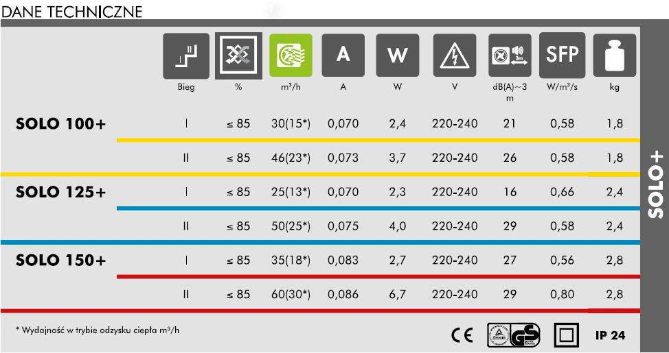 Uwaga: rzeczywista wydajność i głośność zależą od warunków montażowych (grubość i długość kanału, opory, szczelność).
