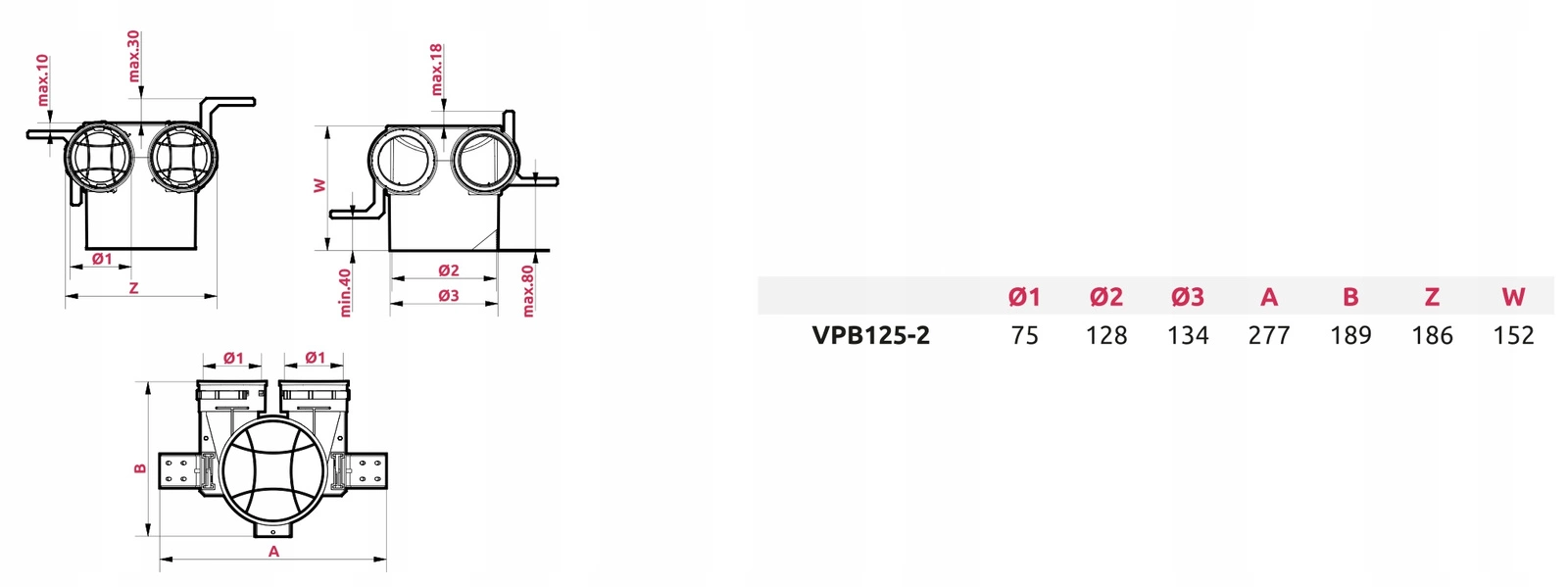 Typ: skrzynka rozprężna VPB (połączenie 2xØ75 mm z Ø125 mm)